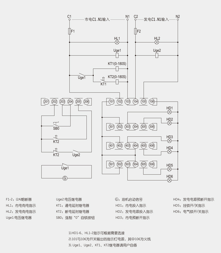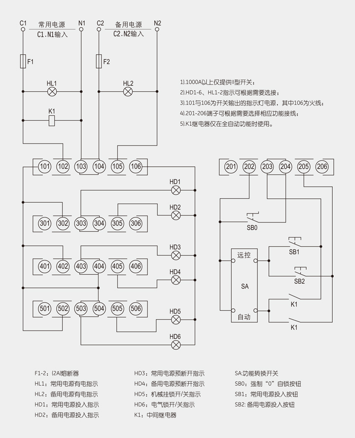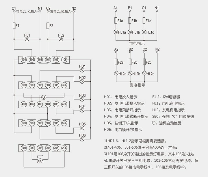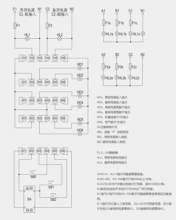 3.面板开关内已接入网适用主机电源开关的C1.N1.与应急主机电源开关C2.N2