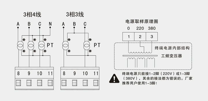 用PT导入线电压信息时的接线方法图: