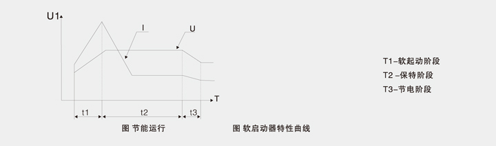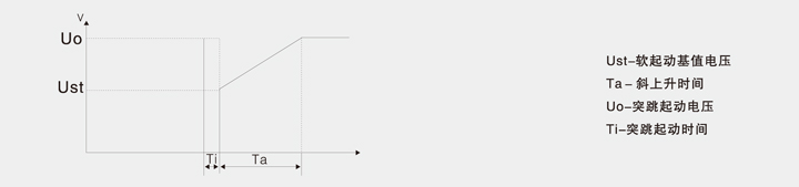当下达软起动命令 ,软起动器输出一个电压Ust ,这个电压叫软起动基值电压(设定范围为20-75倍额定电压) 。之后 ,电压线性上升 , 从软起动基值电压增加到额定电压 。这段时间即为斜坡上升时间Ta(1-60秒) ,斜坡到顶后 ,起动完毕 ,斜到顶继电器动作 。为了克服有些负载比较大的静摩擦转矩 ,本装置提供了可选的突跳起动(范围01-1秒) ,突跳起动电压U:为额定电压 ,时间可设定 。