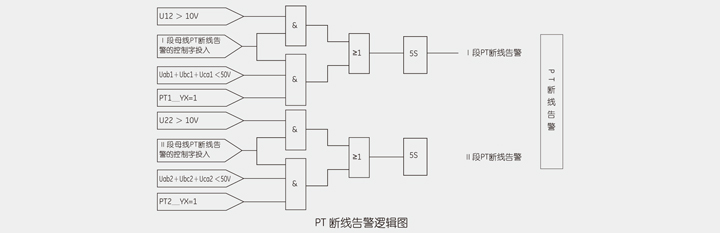 本装置设置失压判断功能 ,配置相应的压板和控制字 。在实际的Ⅰ母线电压小于“Ⅰ母无压检查定值”的情况下装置延时4S发Ⅰ母无压告警信号 ,在实际的Ⅱ母线电压小于“Ⅱ母无压检查定值”的情况下装置延时4S发Ⅱ母无压告警信号 。