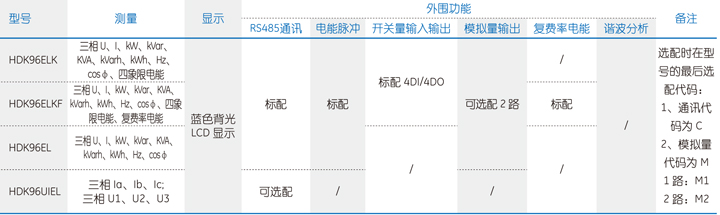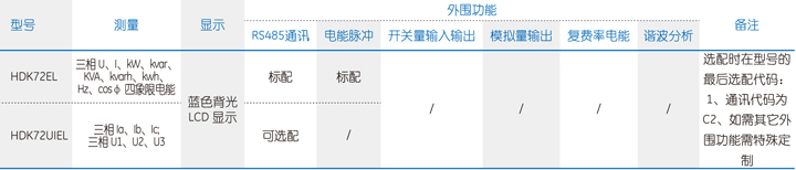 HDK系列多功能电力仪表是针对电力系统、工矿企业、公共设施、智能大厦等电力监控、智能控制、计量考核的应用场合设计的高精度、高可靠性、高性价比的智能仪表产品 。该系列仪表采用高精度专用AD芯片和高可靠性的MCU设计 ,可以测量三相电网中的所有电量参数如三相电压、三相电流、有功功率、无功功率、功率因数、电网频率、双向电能计量及THD等 ,具有标准电能脉冲和RS485通讯接口 ,可选多种扩展功能模块(开关量输入输出、模拟量输出、复费率电能统计、谐波分析等) 。