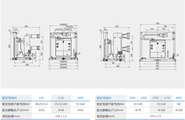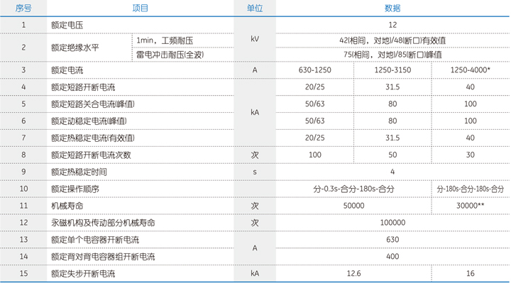 * 额定电流大于3150A时应有通风措施 。** 根据所选用的真空灭弧室而有所差别 。