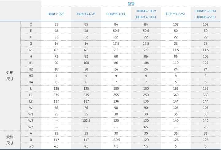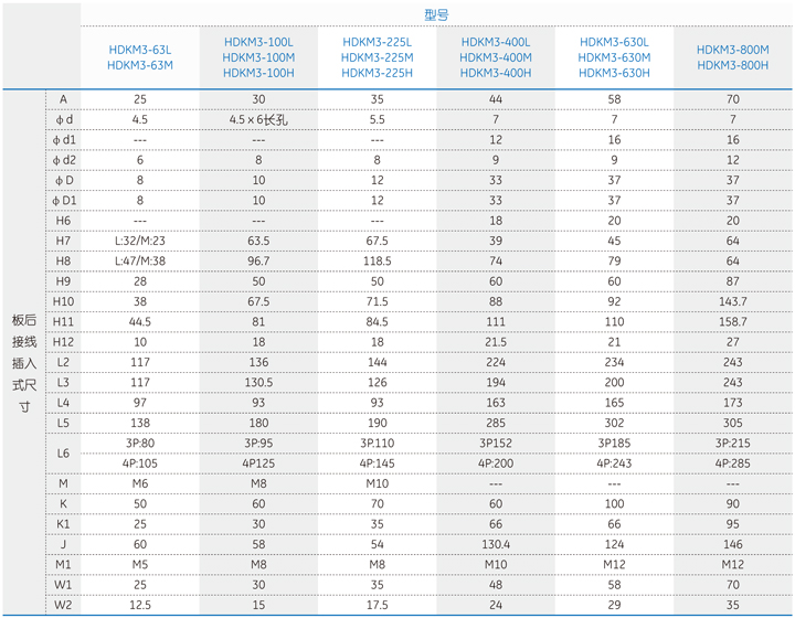 HDKM3-100 为(10)、16、20、25、32、40、50、63、80、 100A十多级;[带()为不介绍外形尺寸]
