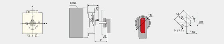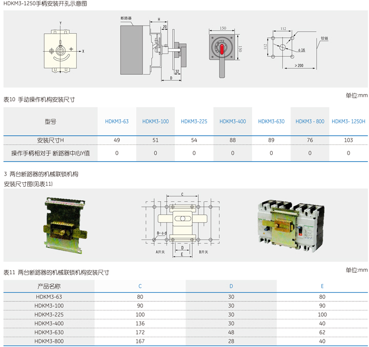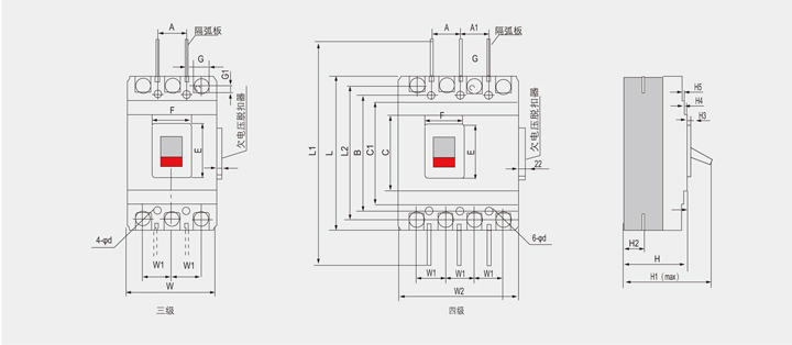 注:安装时先将断路器装在安装架上 ,再将联锁机构装在断路器上 ,断路器相关安装尺寸见表3、表4 。