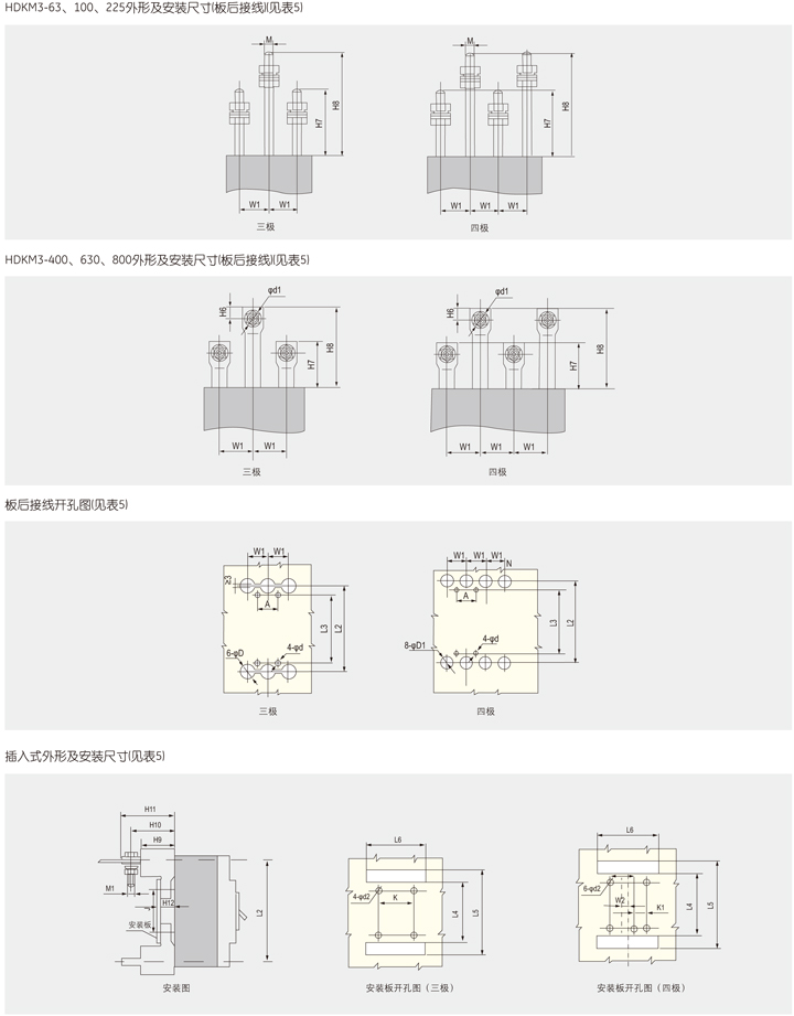 HDKM3-63, 100、225样貌及的安装尺寸图(板前插头接线处)