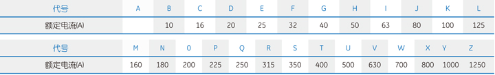 用户在订货时采用订货代号进行订货 。 订货代号组成如下: 产品型号+额定电流规格代号(见表)